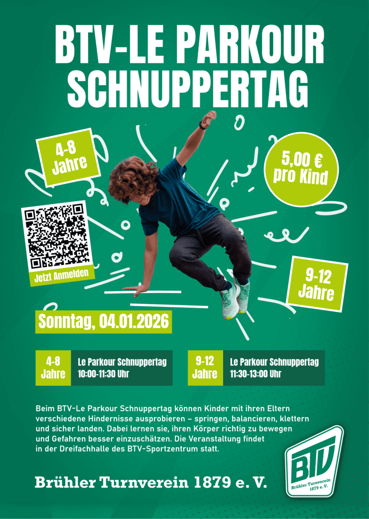 Beim BTV-Le Parkour Schnuppertag können Kinder gemeinsam mit ihren Eltern verschiedene Hindernisse ausprobieren: über Turnkästen springen, balancieren, klettern und lernen, richtig zu landen. Le Parkour ist eine vielseitige Sportart, die hilft, den eigenen Körper besser kennenzulernen und Gefahren realistisch einzuschätzen.