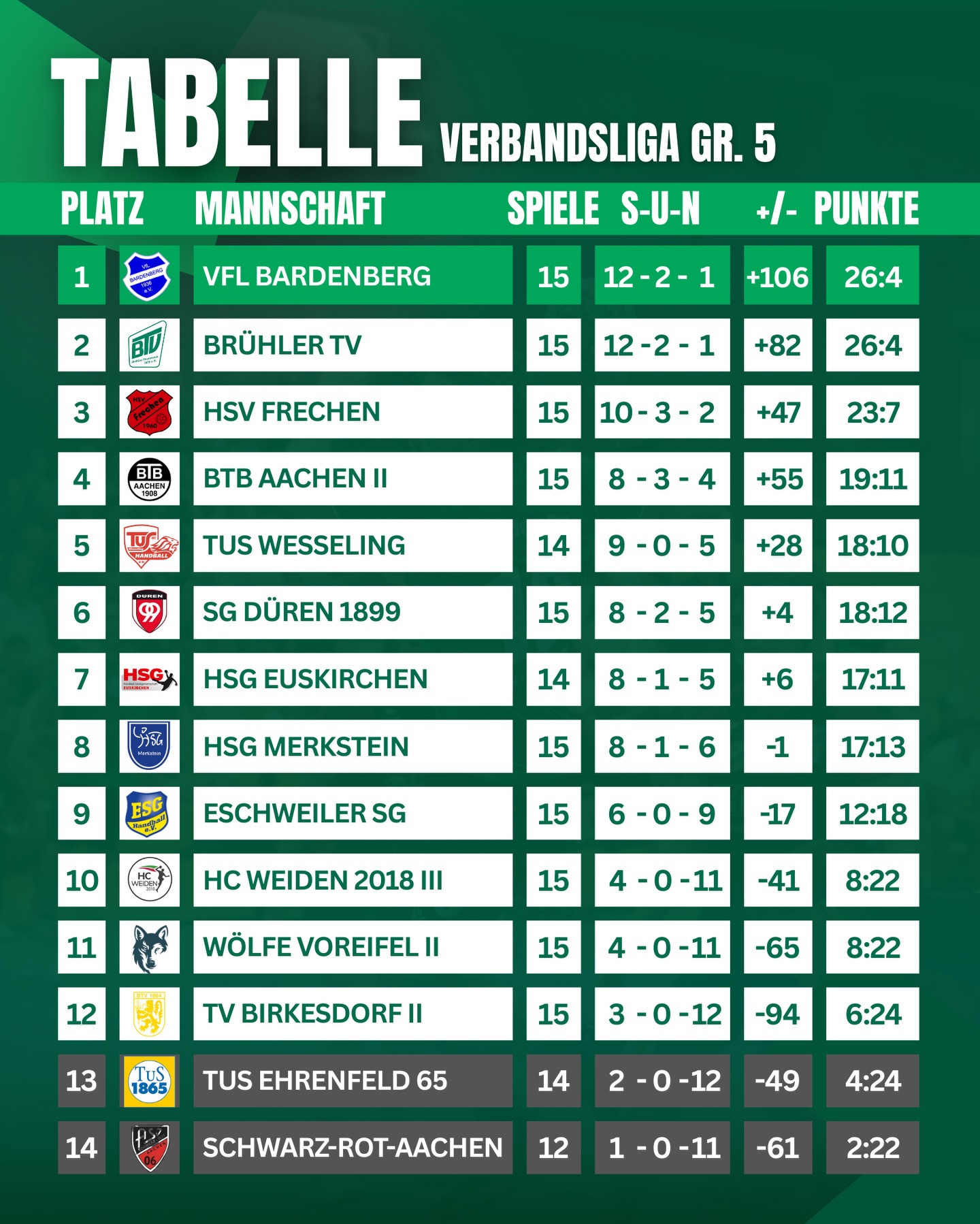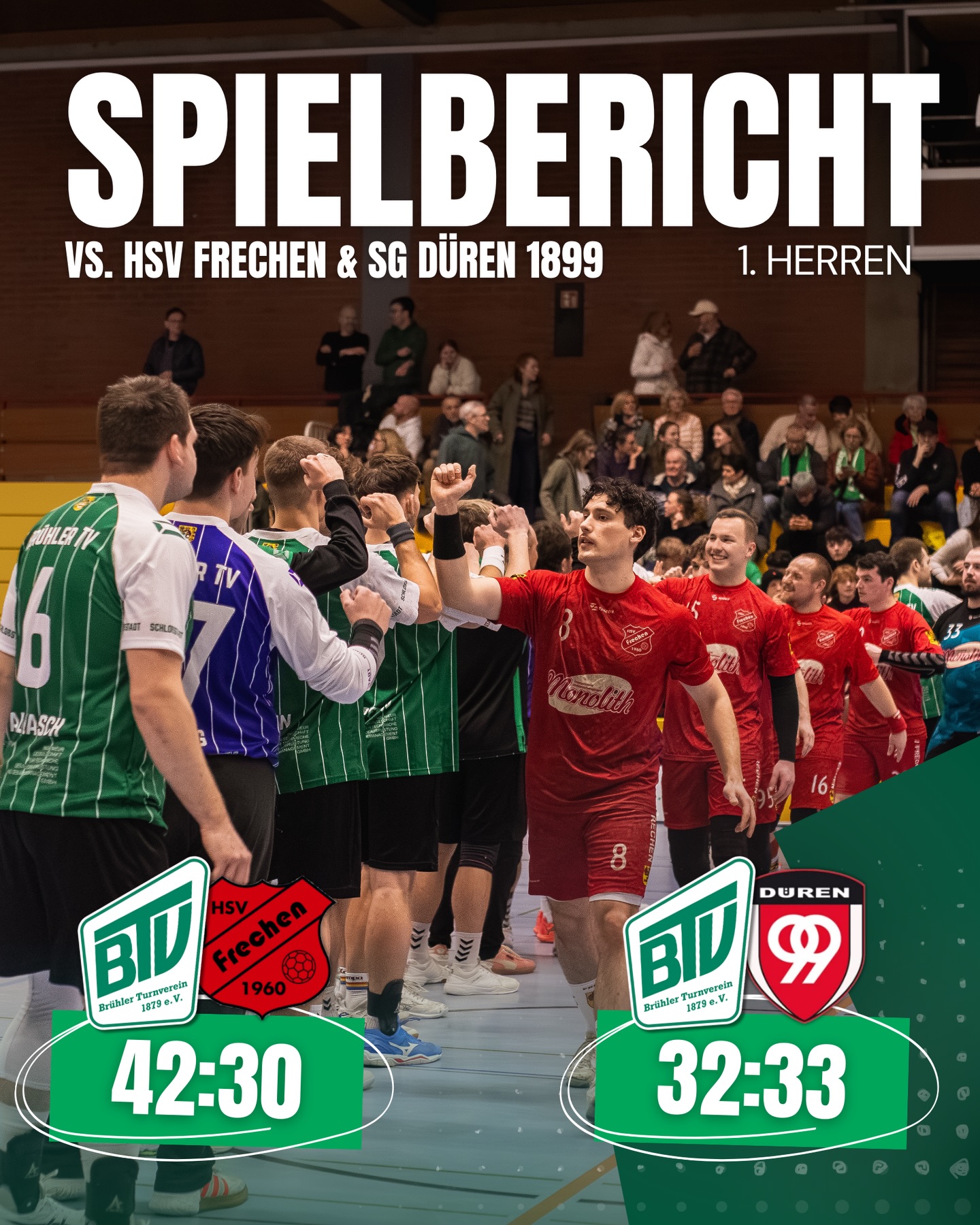 Gegen Frechen erwischten die Grün-Weißen einen wahren Sahnetag. Von Beginn an standen sowohl die Abwehr als auch das Tempospiel. Bereits zur Halbzeit hatte man sich einen komfortablen 11-Tore-Vorsprung erspielt (20:9). Auch in der zweiten Hälfte blieben die Brühler am Ball, zeigten im Angriff enorme Effizienz und gewannen am Ende verdient mit 42:30.