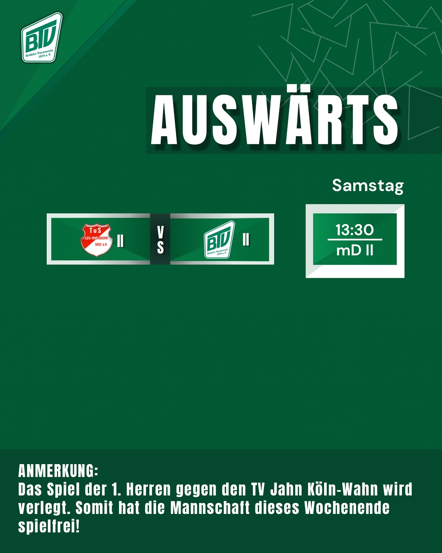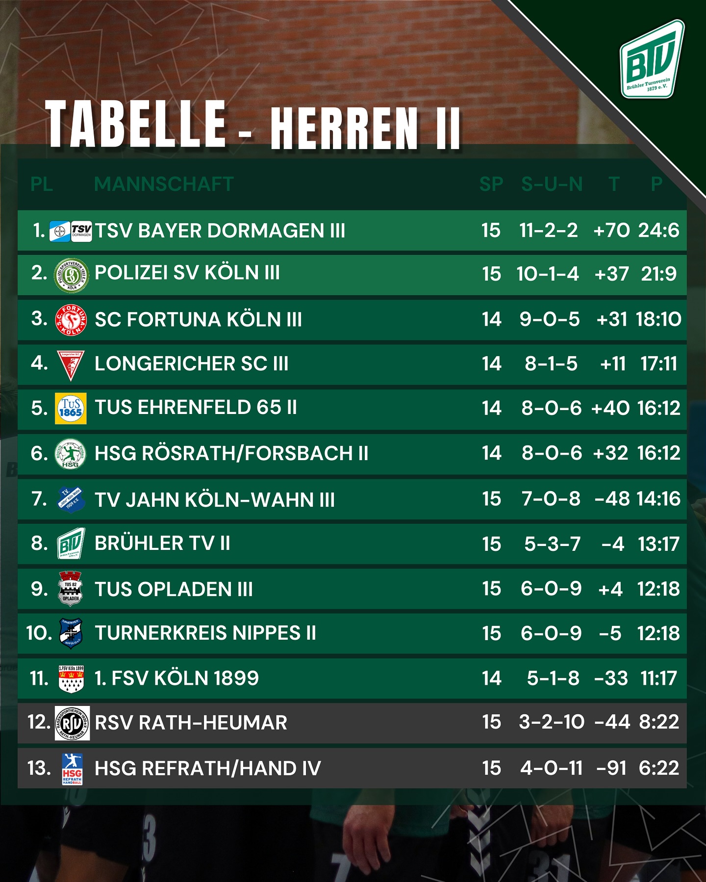 Am Samstag traf die zweite Herrenmannschaft des BTV auf den TV Jahn Köln-Wahn – ein Gegner, der bereits im Hinspiel für ein hart umkämpftes Spiel gesorgt hatte. Die Brühler starteten mit einer starken Defensive, besonders der Mittelblock stand sicher, und auch im Angriff wurden die Angriffe gut ausgespielt. Dennoch gelang es nicht, sich entscheidend abzusetzen, sodass der Vorsprung bis zur 15. Minute nie mehr als zwei Tore betrug.