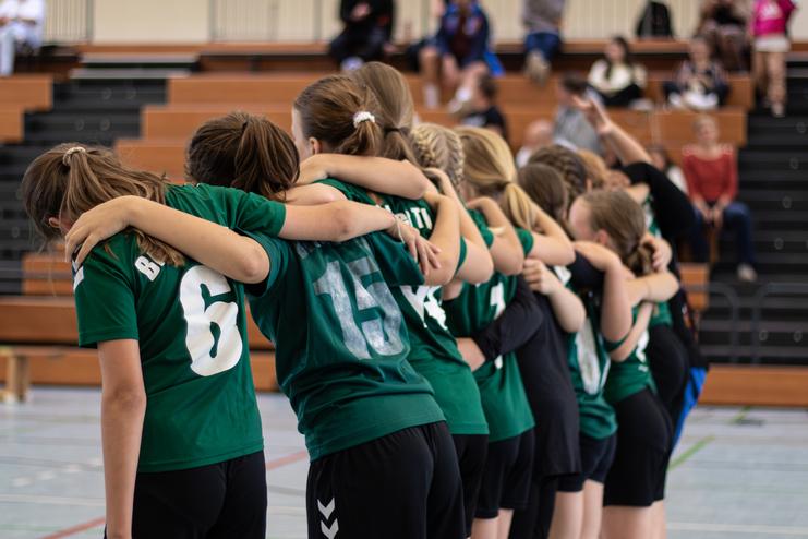 Gruppe junger Mädchen in Sporttrikots bespricht sich in einer Sporthalle. Nummern und Vereinsnamen auf den Shirts sichtbar.