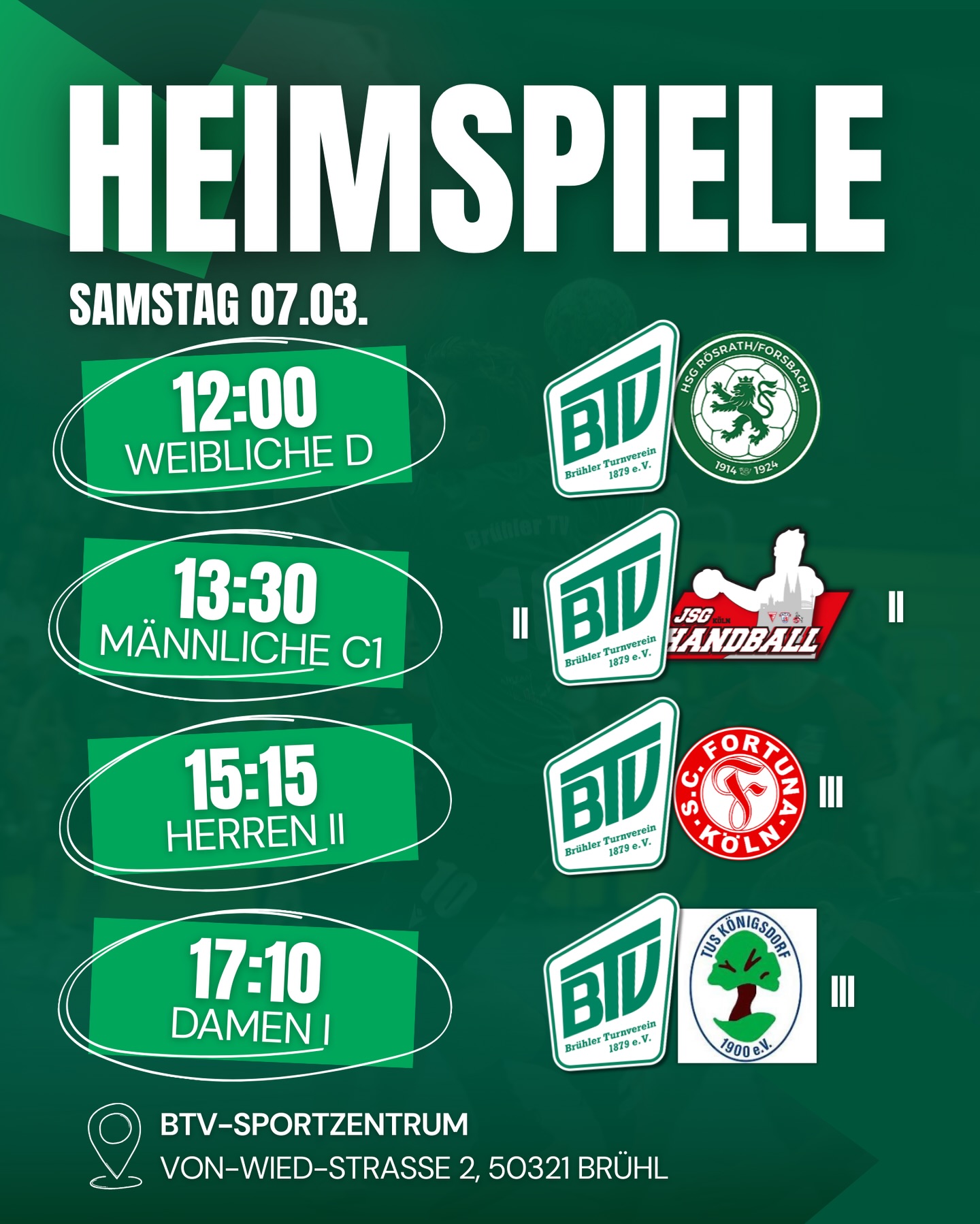Am Samstag wird im BTV-Sportzentrum gespielt. Die erste Partie des Tages wird die weibliche D Jugend im Spitzenspiel um 12:00 Uhr bestreiten. Den Abschluss macht unsere erste Herren um 19:15 Uhr👊