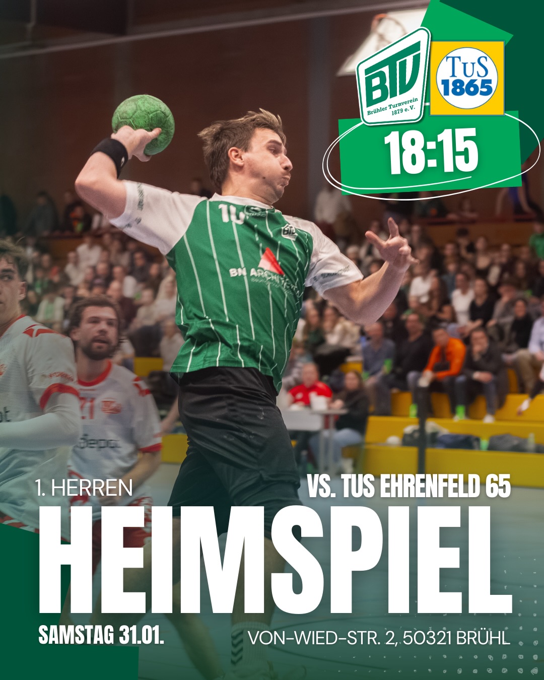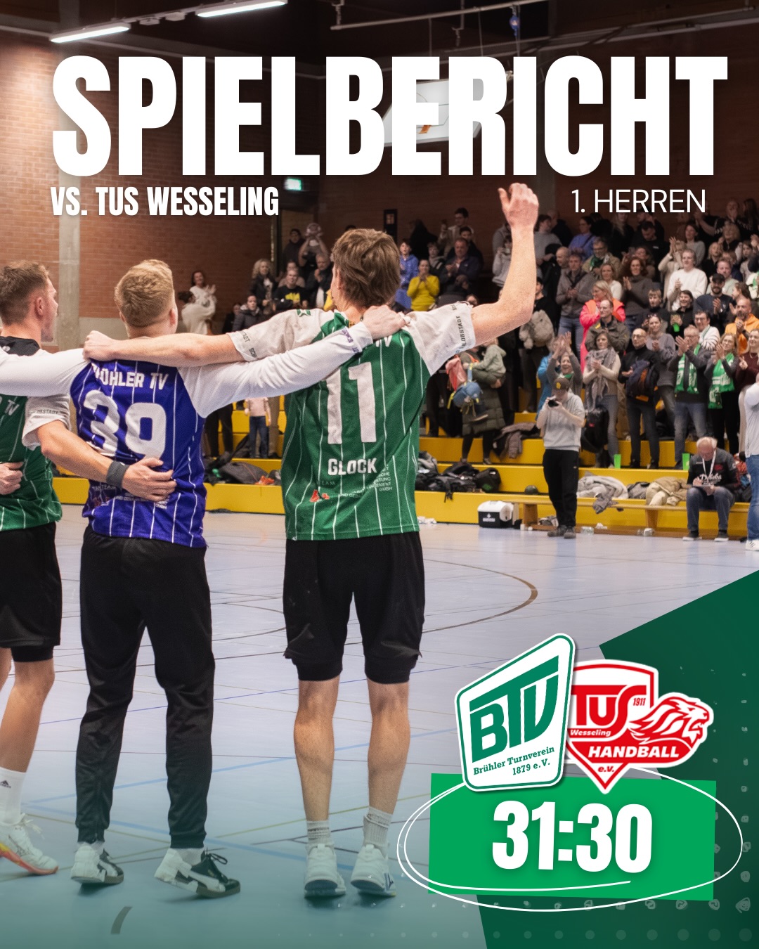 In der 50. Minute war es dann so weit: Die Halle kochte förmlich, als die erste Führung zum 24:23 fiel. Die Crunchtime war eröffnet. Nun legten die Brühler mehrfach vor und gaben die Führung nicht mehr aus der Hand. Am Ende stand ein umkämpfter 31:30-Derbysieg.