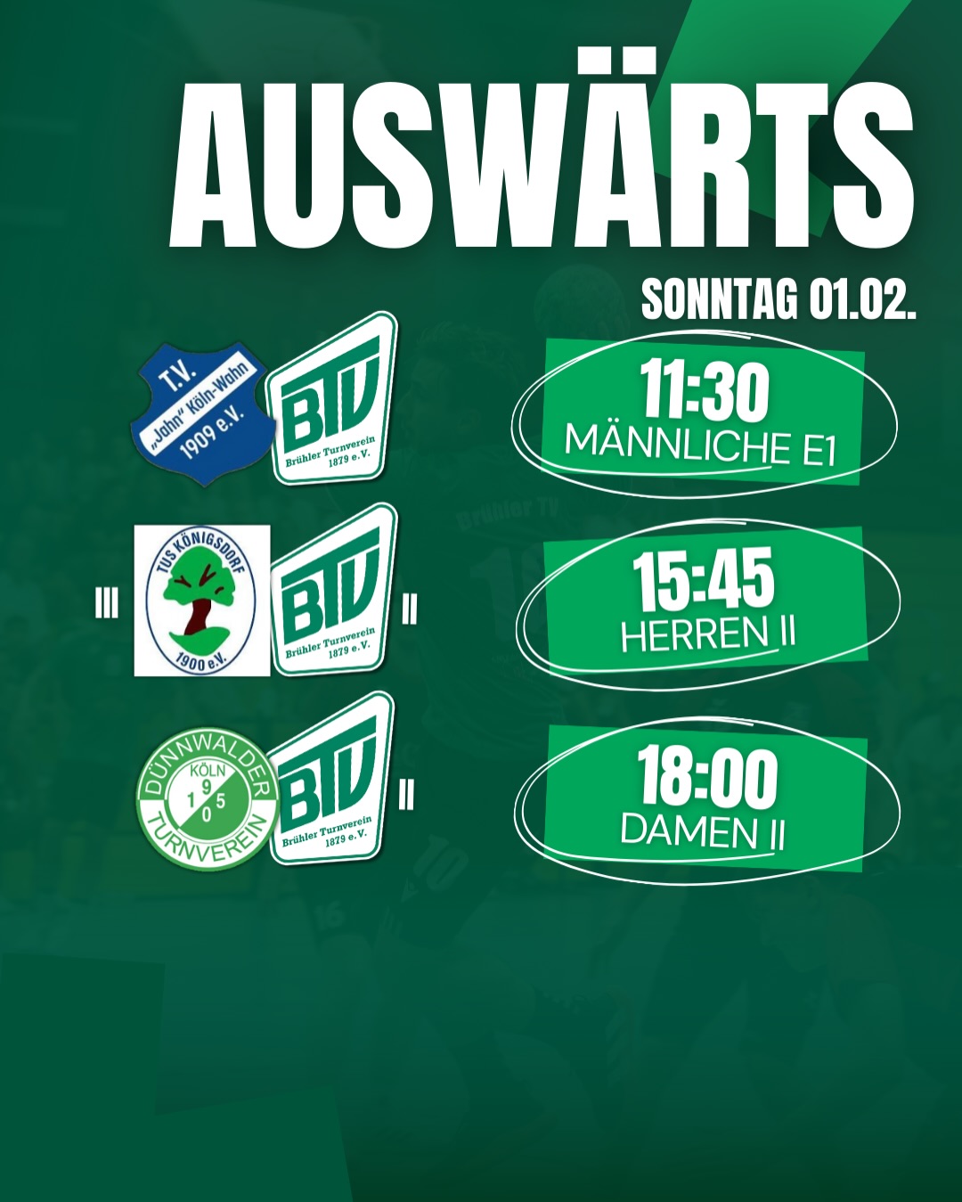 Auch auswärts geht’s rund: So sind unter anderem unsere Herren 2 am Sonntagabend in Königsdorf gefordert