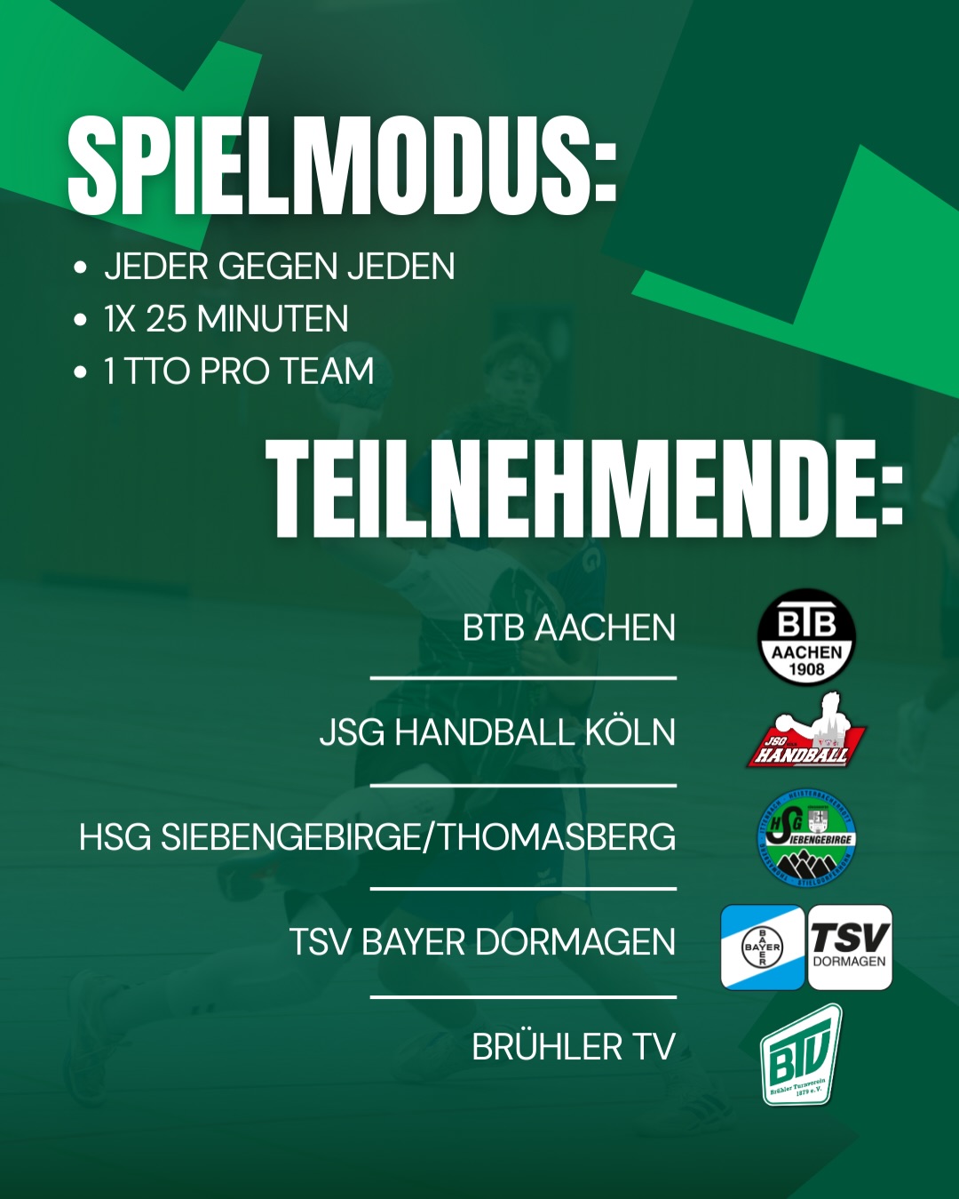 ⏰ Um 10 Uhr eröffnet das Team des BTB Aachen gegen die JSG Handball Köln das Turnier.