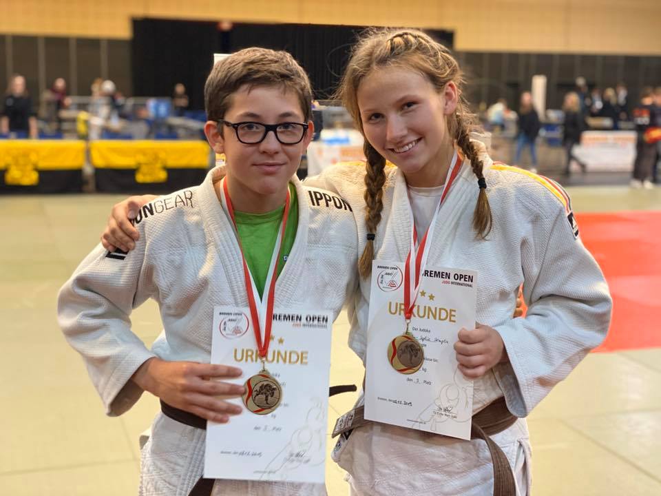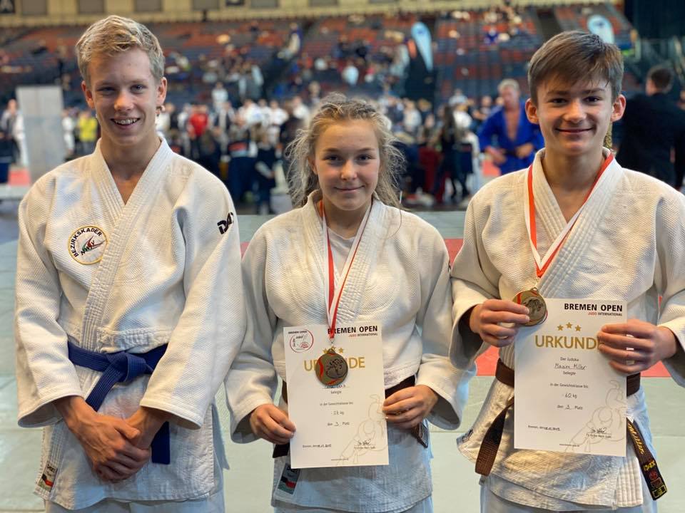 Ann-Sophie Stemplin und Leo Mattarei erkämpften sich beim internationalen Turnier in Bremen die Bronzemedaille! Beide zeigten enormen Kampfgeist, tolles Judo und vor allem stellten sich beide sehr gut auf die Zurufe ihres Trainers ein. Super Leistung! Sandro Scholz verlor seinen ersten Kampf gegen den späteren Turniersieger und kämpfte sich mit vier Siegen und einer weiteren Niederlage auf den 7. Platz. Caspar Golland musste sich nach zwei gewonnen Kämpfen im Halbfinale gegen den späteren Turniersieger geschlagen geben. Leider verlor er auch das kleine Finale um Bronze und wurde somit Fünfter. Lilith Sauer scheiterte ebenfalls im Halbfinale und kleinem Finale und kam somit auch auf einen undankbaren 5. Platz. Juliette Karim gewann zwei Kämpfe, musste jedoch verletzungsbedingt leider aufgeben. Eine Zerrung in der Schulter zwang sie zur Aufgabe.