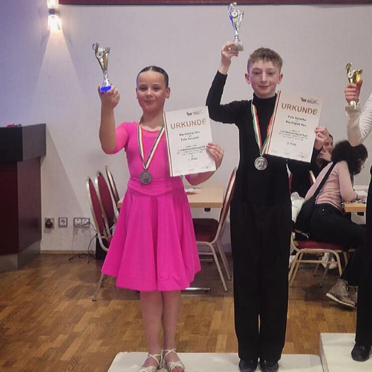 Anschließend zeigten Toni und Lena in der Kategorie Paartanz Kinder mit den Tänzen ChaChaCha, Langsamer Walzer, Tango und Quickstep ihr Können. Da sie als einziges Paar den Quickstep gewählt hatten gehörte die Fläche bei diesem Tanz ganz allein ihnen. „Ein tolles Gefühl!“, waren sich beide anschließend einig. Auch bei den Wertungsrichtern schien der Tanz Eindruck gemacht zu haben, denn die beiden konnten sich bei der Siegerehrung über den zweiten Platz freuen.
