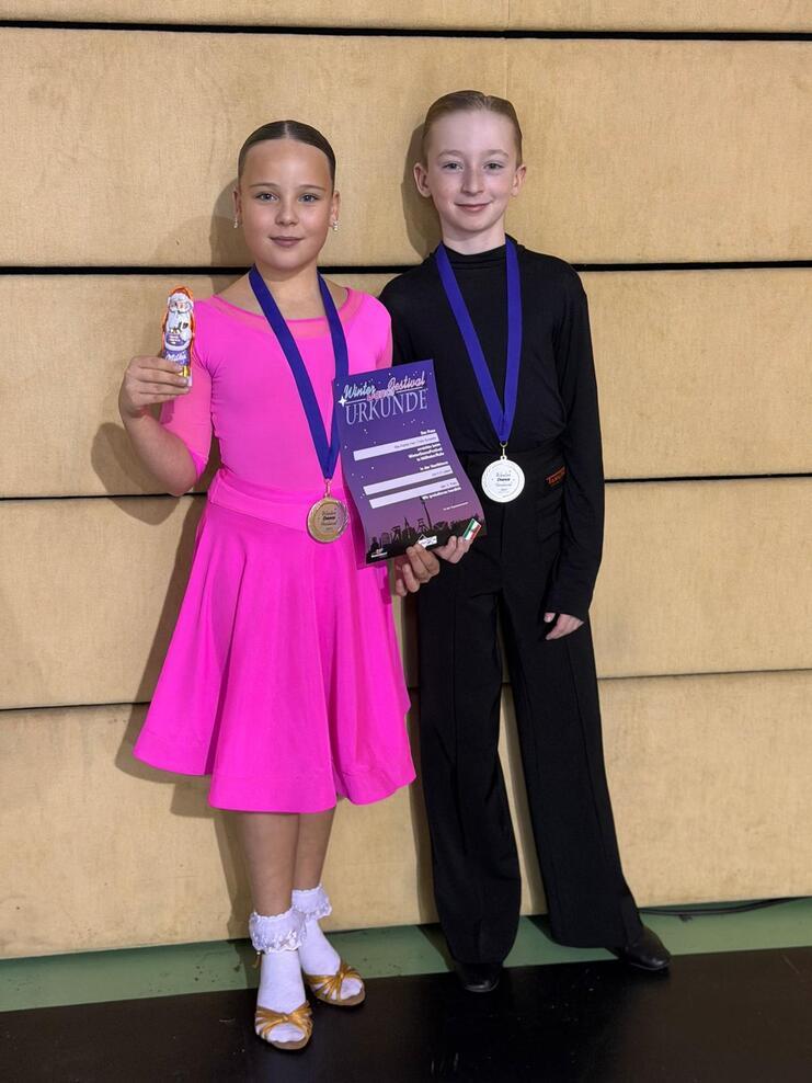 Tanzpaar in festlichen Kleidern steht auf dem Siegerpodest mit Urkunden, hinter ihnen das Logo des Tanzsportclubs Dortmund.