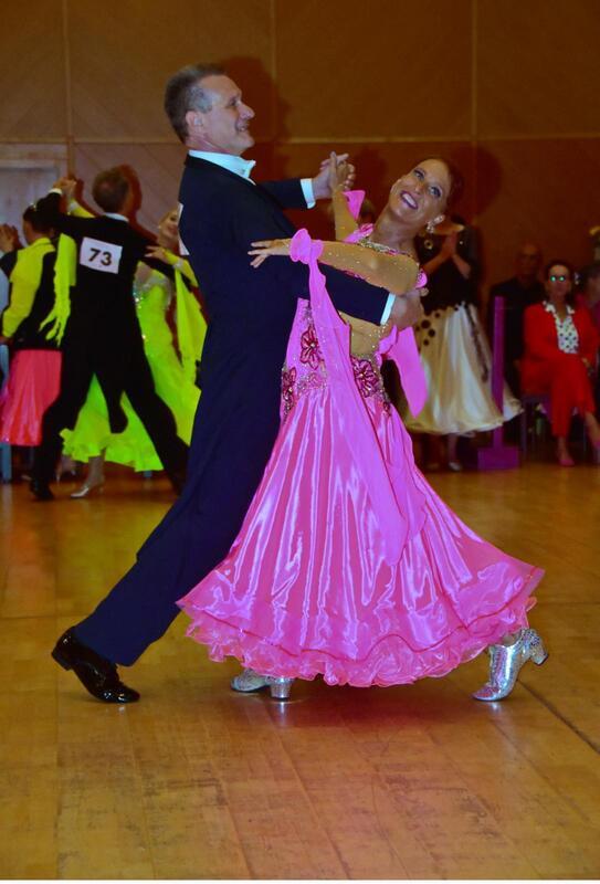 Tanzpaar in eleganter Kleidung tanzt in einem Saal; die Frau trägt ein lila Kleid mit Glitzer und Federn.